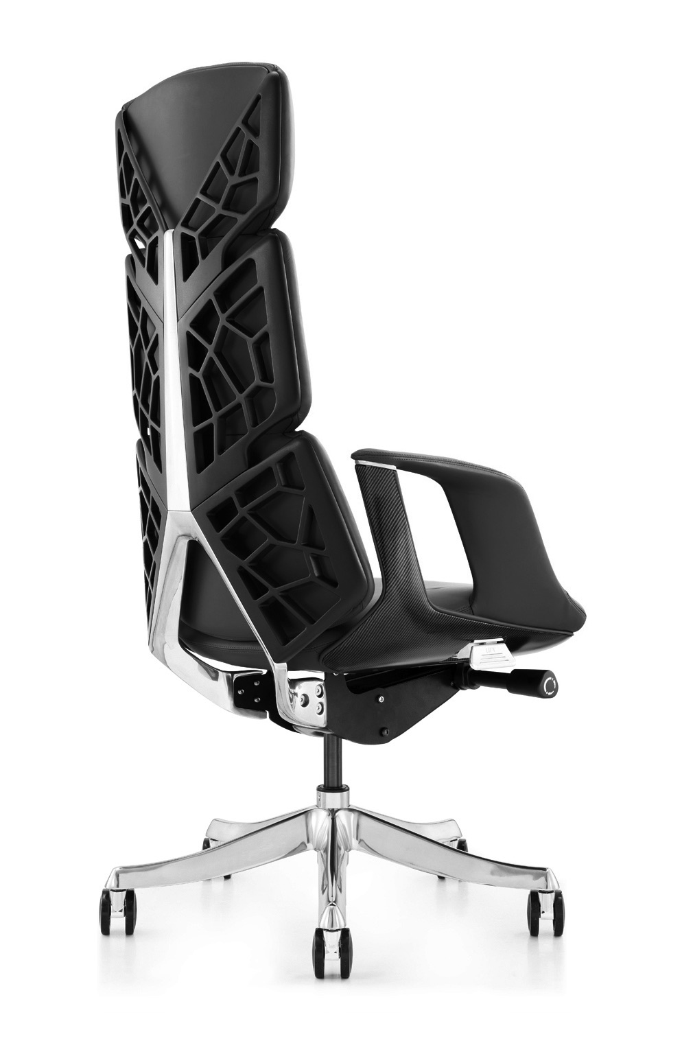 This chair, designed with a "futuristic industrial aesthetic" concept, seamlessly blends technological sophistication and comfort: The backrest features a geometric frame crafted from aluminum alloy, combining lightweight design with strong support; the contact surface is upholstered in top-grain cowhide, offering a delicate touch while remaining durable and breathable; and an internal lightweight steel frame provides stable support while maintaining structural resilience. Overall, it serves as both a sophisticated piece for the office space and a customized "dynamic support system" for the body.